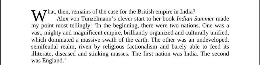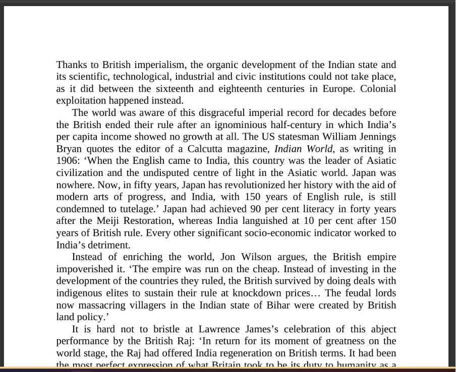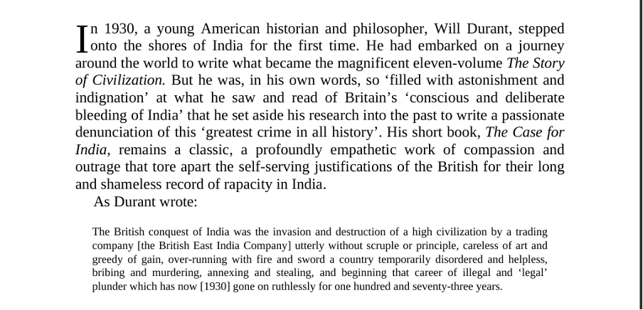The british apologists, the word Tharoor used to address the so-called supporters of brutal rule, suits them very well. According to them, the british gave us the political unity, a free press, a railway system etc. There is a detailed discussion about all these illusions and many more like them. While he scathed out every deed ruthlessly, there is no emotional outcry that shadowed the clarity of the content. Although his trust and respect towards gandhi-nehru-thoughts of school is firm, it is limited to a tiny part of the whole book.
