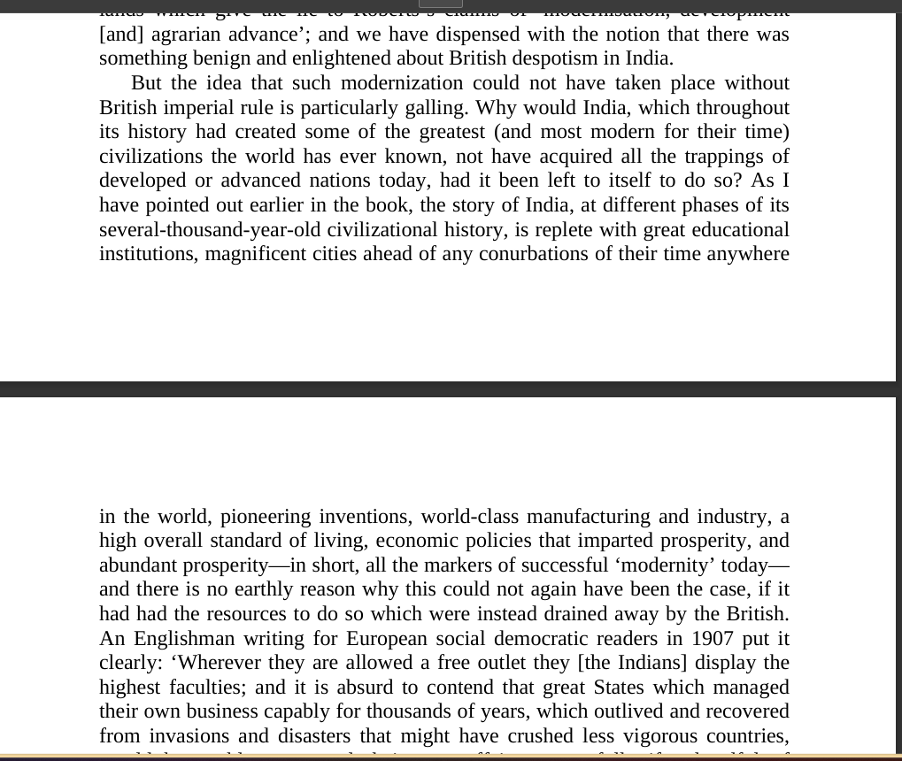 Shashi Tharoor gave a detailed account of statistics about the damage done to industries like textiles, raw materials, artisanry, steel etc. That is completely an economic drain, like the intellectual one these days. Not only money, they looted the self-confidence of our society, they humiliated our ancestors and they broke the whole system, which is a natural feature of this part of the world, for their selfish motives.
