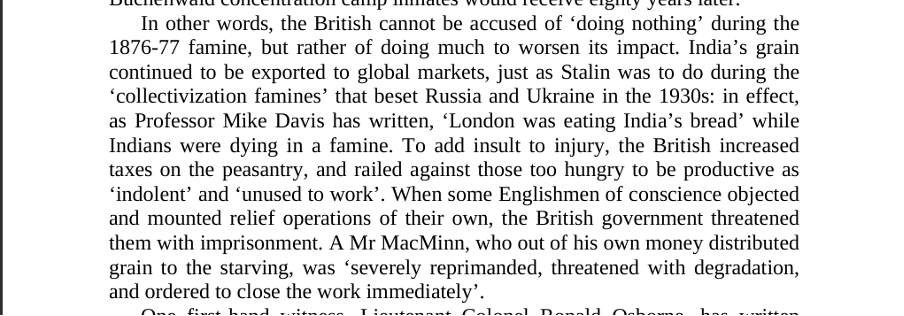 Of course, famines are not new to mankind, but there is a way to deal with them for society and rulers. Especially for Indians, charity is a noble thing and it works indeed. In the past, native rulers took care of the system. For example, they refrained from collecting taxes in that period, did charity work for humans as well as animals and tried to handle the situation as per their limitations. The brutish government mishandled it and their history repeated itself as in other colonies again and again.